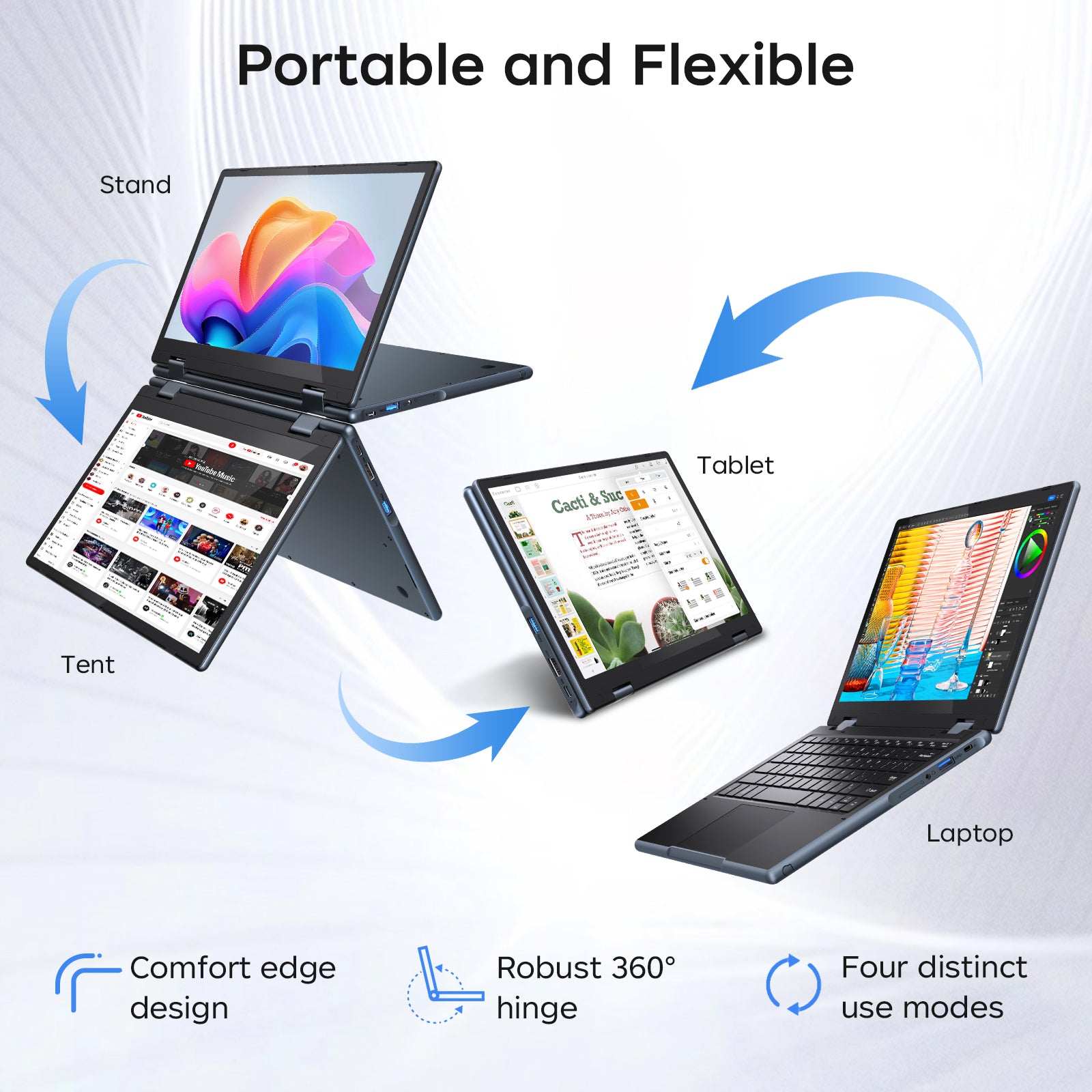- 360° Flip-and-Fold Design: Seamlessly switch between four modes (laptop, tablet, tent, stand) with ease. RNRUO Transition intelligently adjusts apps to full screen automatically as you shift modes.