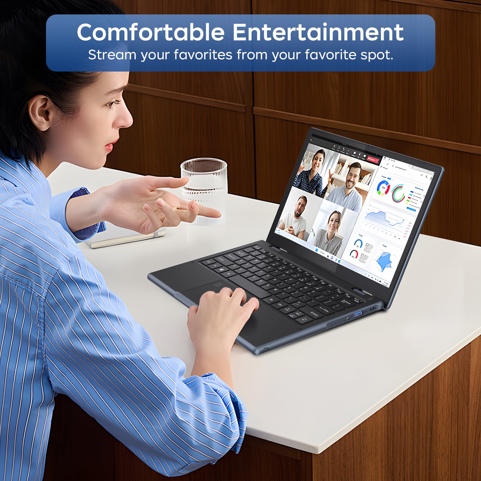 The 11.6” RNRUO Touchscreen Ultra Slim Laptop is a compact, portable, and versatile device. Its 360° flip touchscreen supports multiple usage modes—tent, stand, and tablet—adapting to diverse scenarios. Equipped with 16GB RAM and 256GB SSD, it delivers ample performance for basic computing needs: web browsing, video streaming, and light productivity tasks. Powered by Windows 11, it offers a user-friendly and familiar experience for most users.