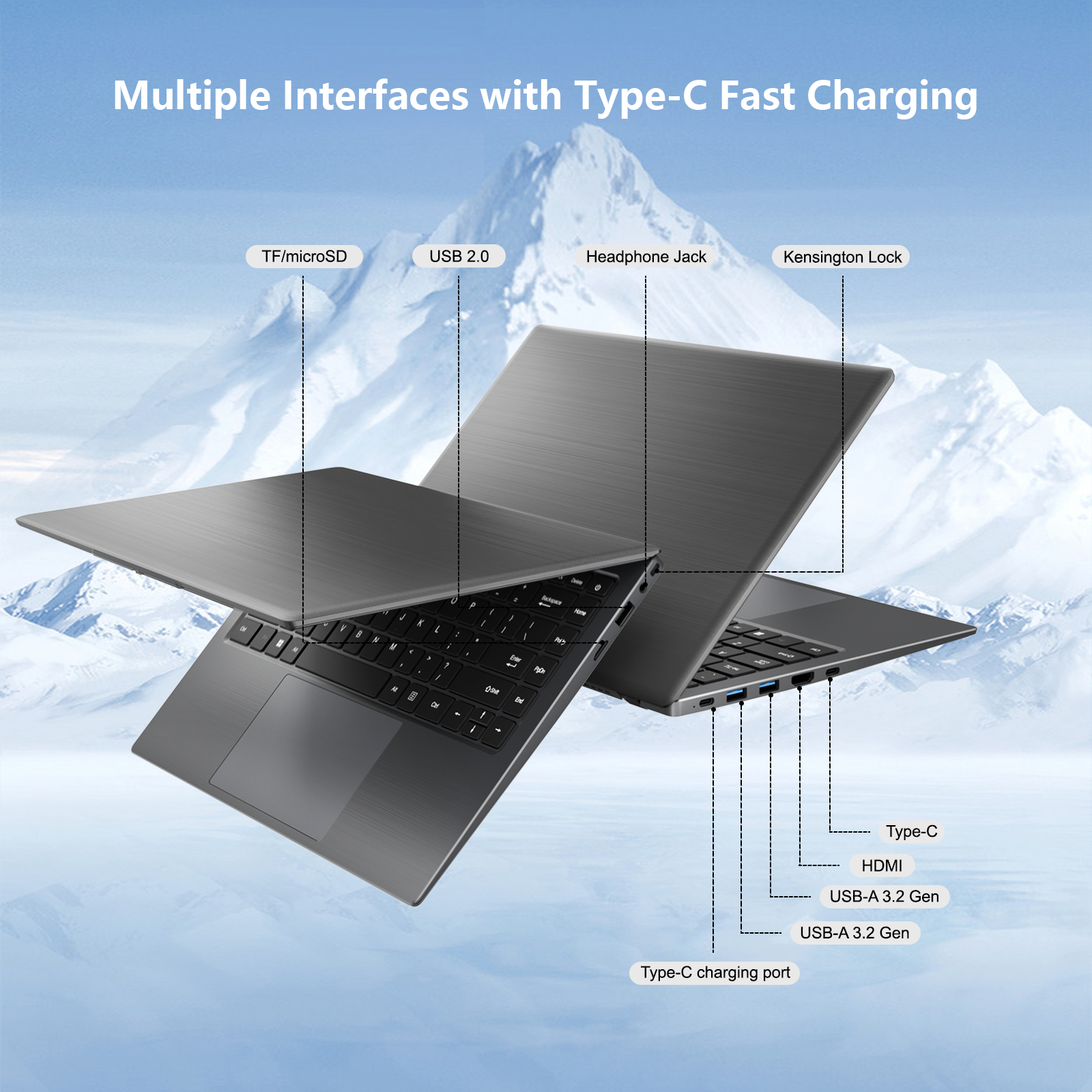 8) Interface: USB3.2*2+USB2.0, HDMI*1, ∮3.5mm*1, TYPE-C PD Charger*1, TF*1, Kensington Lock Slot*1, Full-function Type-C*1