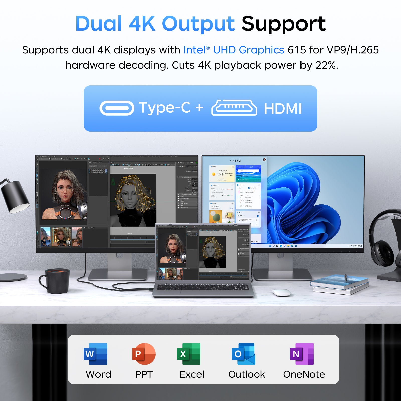 - Long Battery Life & Quiet Operation: A 5W TDP enables up to 8 hours of office use. Type-C PD fast charging reaches 80% in just 30 minutes. Fanless design ensures quiet operation, perfect for libraries. Compatible with phones, tablets, and more—one cable for all, with bidirectional power support.