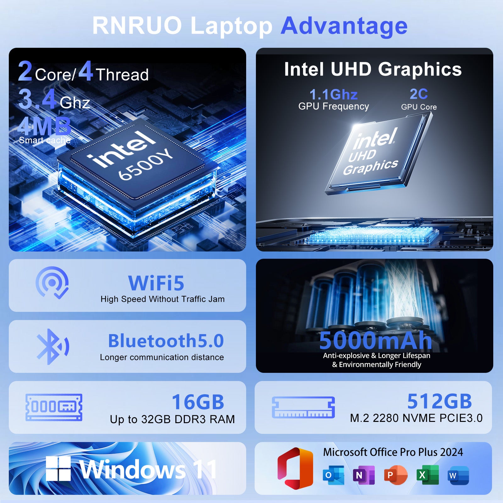 - Pentium Gold Processor: The RNRUO laptop features an Intel Pentium Gold 6500Y processor, 4MB Smart Cache and 5W TDP, offering reliable performance suitable for light gaming, web browsing, and document editing. The integrated Intel UHD Graphics boosts graphics processing, ensuring a smoother user experience.