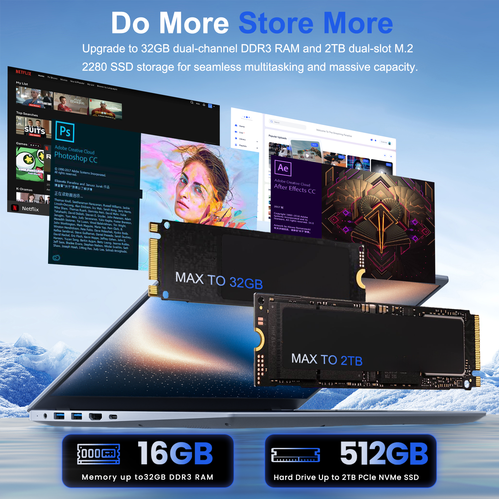 - Powerful Configuration: This Windows 11 laptop features dual-channel 16GB RAM (exp. to 32GB) and a 512GB M.2 PCIe 3.0/SATA3 SSD for blazing-fast performance with ample storage. Experience instant boot-ups, rapid file transfers, and seamless multitasking. Storage is further expandable up to 2TB via M.2 slot or microSD card for virtually unlimited capacity.