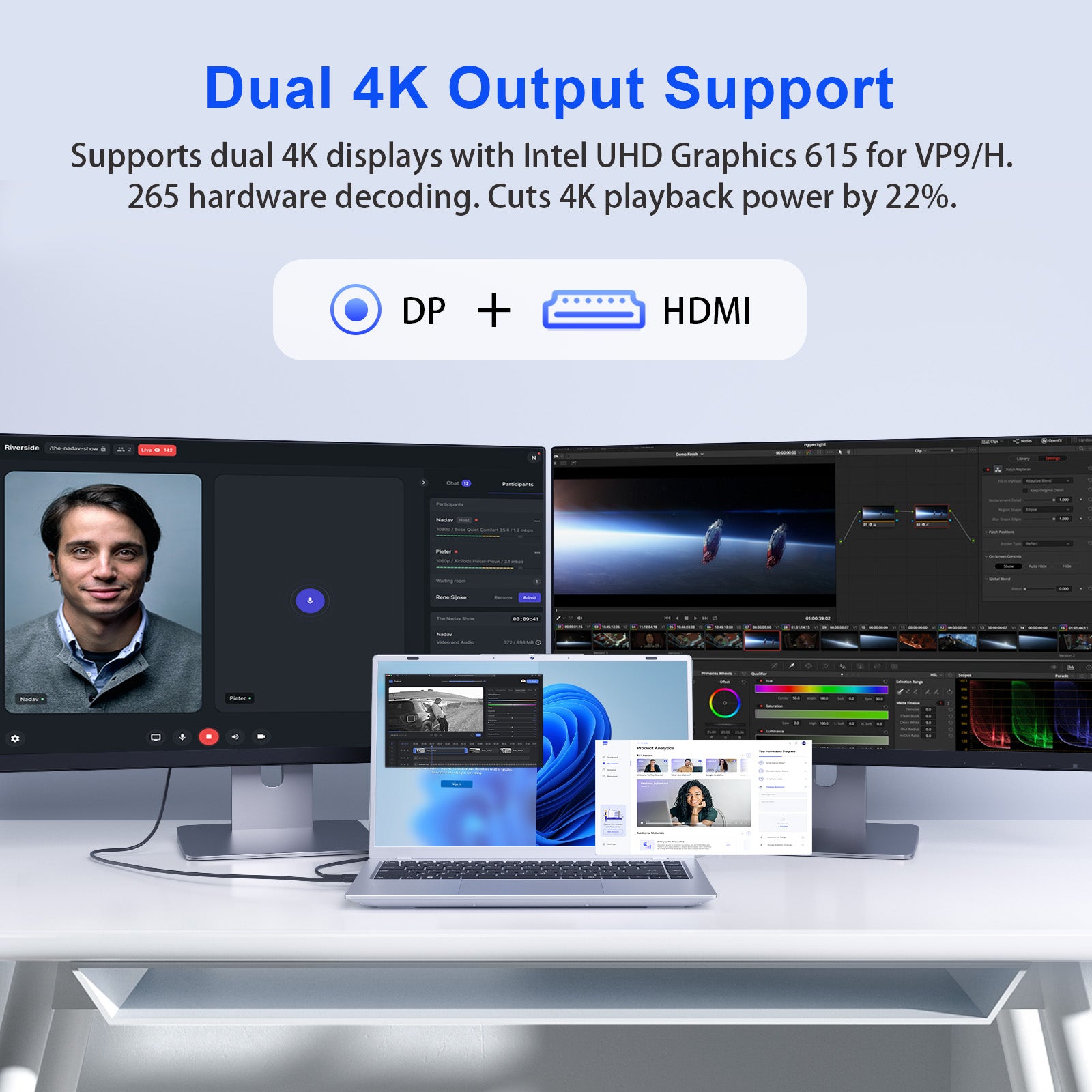 - Dual 4K Display Output: Equipped with HDMI and DP ports for dual 4K@60Hz displays, creates an expansive workspace for professionals. Ideal for financial analysis, content creation, or multitasking-experience enhanced productivity without display limitations.